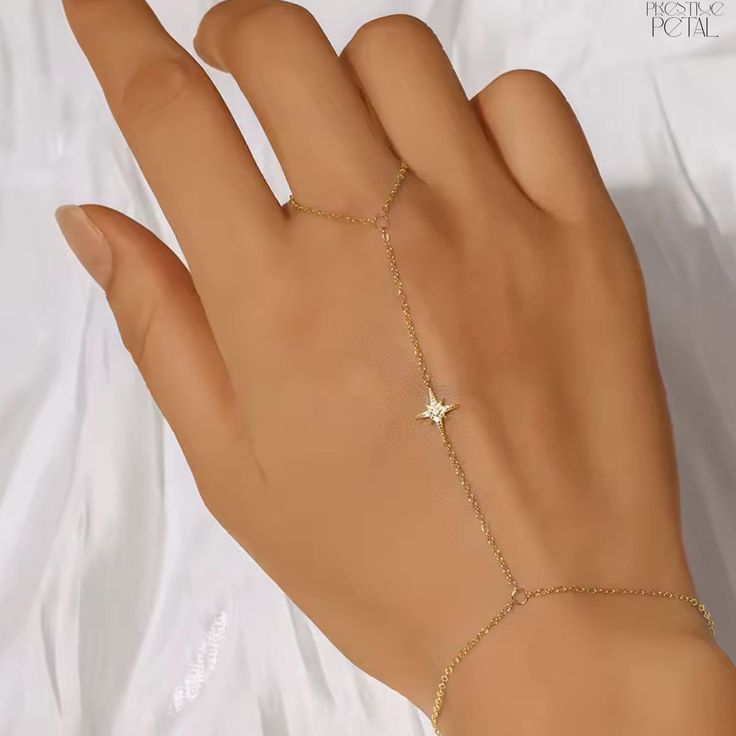 دستبند انگشتی ظریف طرح ستاره. یک اکسسوری شیک و مدرن (Hand Harness) با زنجیر نازک و آویز ستاره‌ای درخشان روی دست. انتخابی خاص و متفاوت برای مجالس و مهمانی‌ها. فوق‌العاده ظریف و فشن.