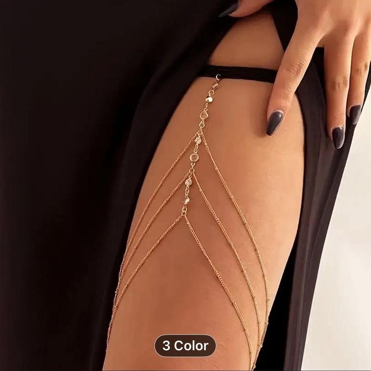 این اکسسوری از چهار رشته زنجیر ظریف تشکیل شده که از بالا تا پایین ران امتداد دارند و مزین به کریستالهای کوچک و براق در طول مسیر هستند. |